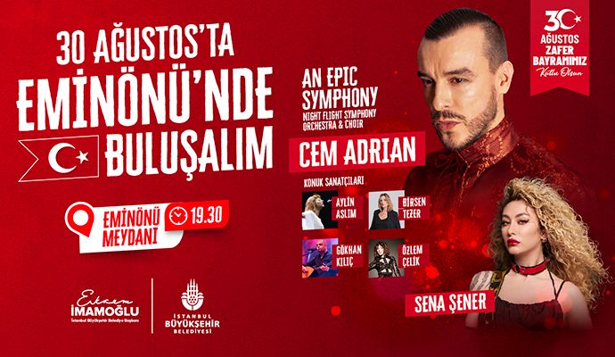 30 Ağustos Zafer Bayramı kutlama etkinliği “An Epic Symphony & Cem Adrian Konseri” ile devam edecek. Birsen Tezer, Aylin Aslım, Gökhan Kılıç ve Özlem Çelik de gecede konuk sanatçı olarak sahne alacak.