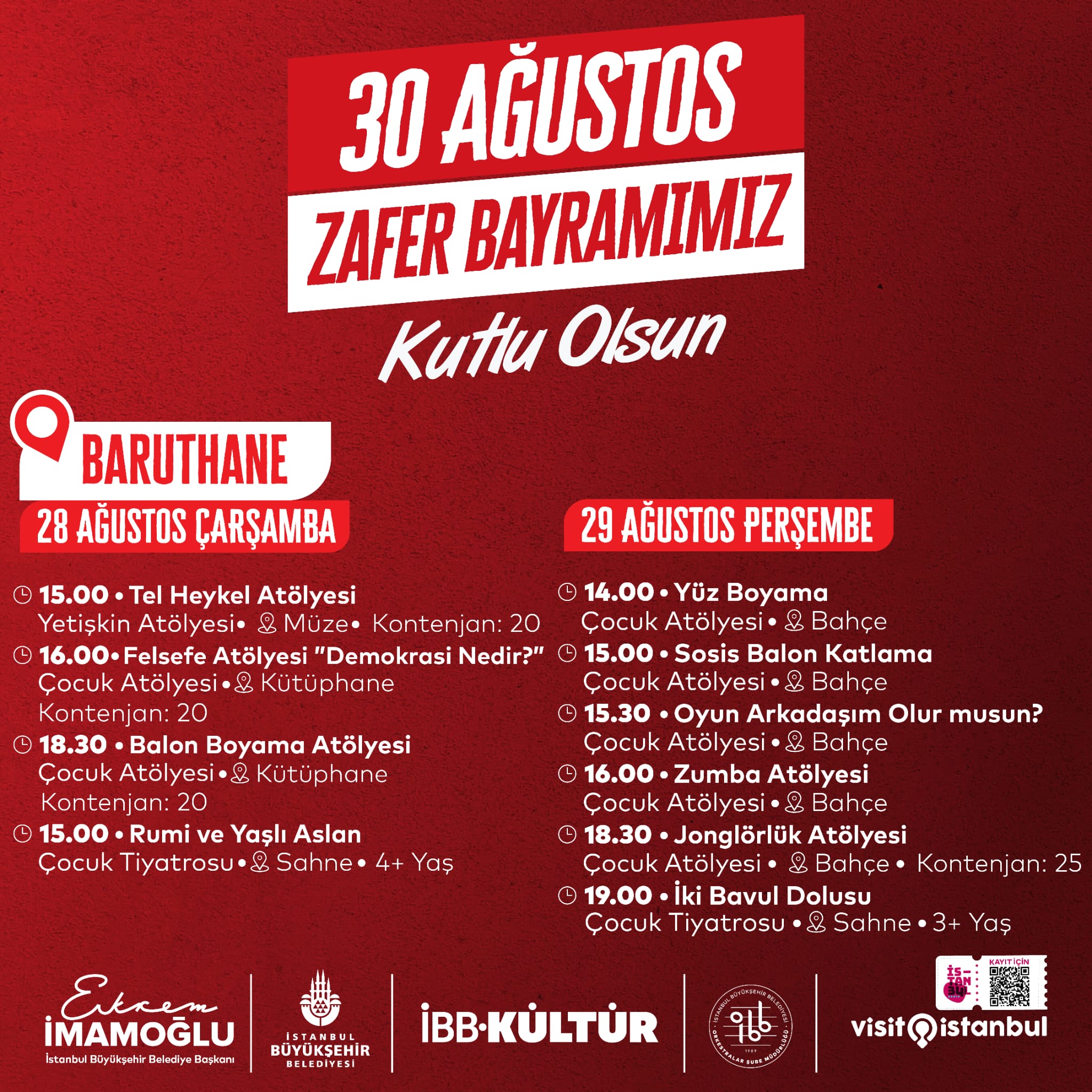 30 Ağustos Zafer Bayramı, İBB Kültür Dairesi Başkanlığı’nın Artİstanbul Feshane, Beykoz Çubuklu Silolar, Müze Gazhane ve Baruthane’de 28 - 29 Ağustos tarihlerinde gerçekleştireceği konserler, tiyatro oyunları ve atölye etkinlikleriyle de kutlanacak.